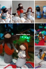 a crocheted nativity set. contains: mary joseph, baby jesus in krib, 3 kings, 2 sheperds, 3 sheeps and 1 angel pattern by Christel Krukkert